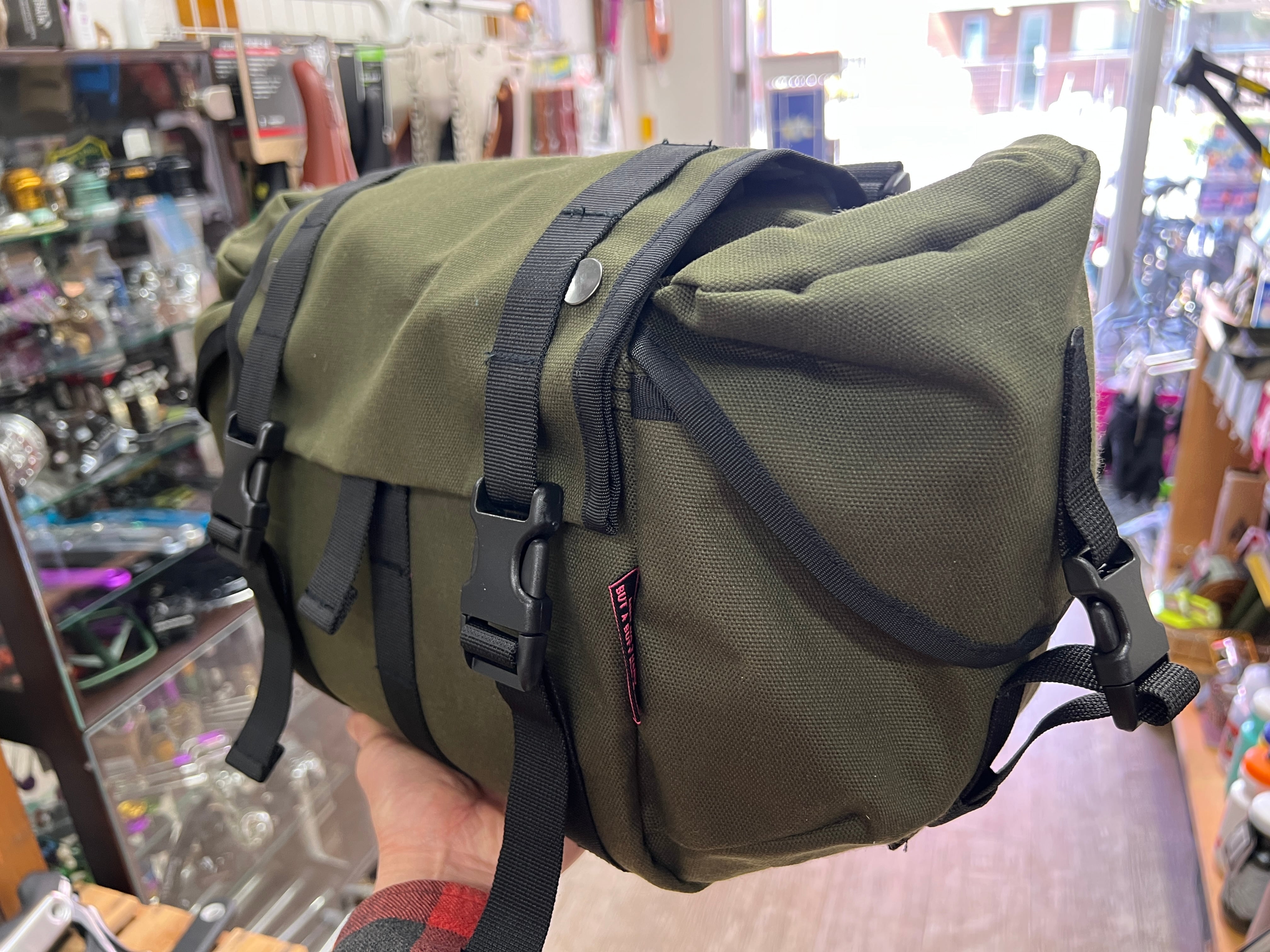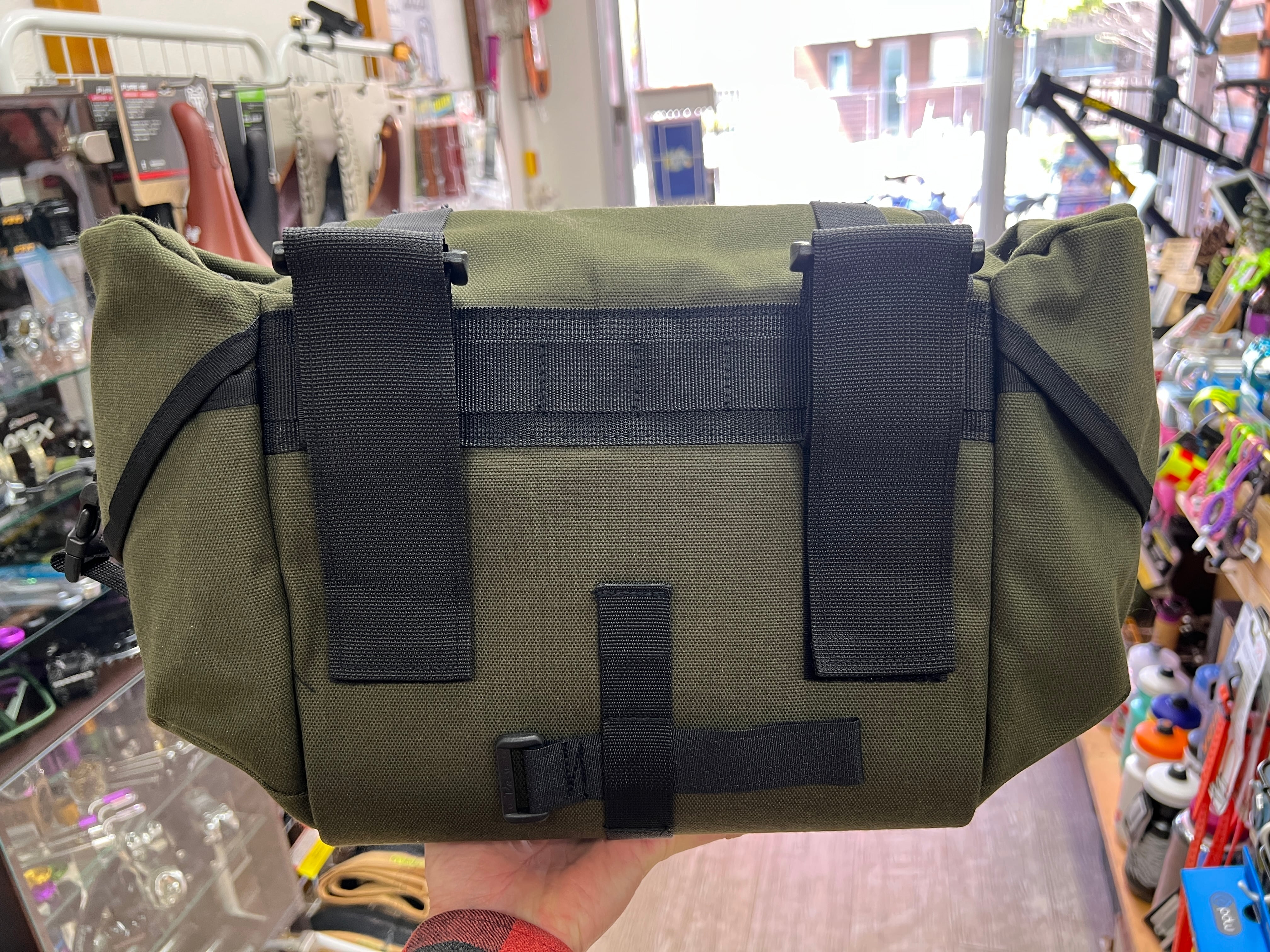 中央のフラップ、メイン荷室の幅が25cmぐらいとお考えください。メーカー公表では42cmのドロップバーから取り付け可能となっていますが、当店としましては46cm以上のドロップバーをおすすめいたします。ハンドメイドであることや、生地の種類などで大きさ膨らみの誤差があります。取り付けに余裕をもってご検討いただけると幸いです。