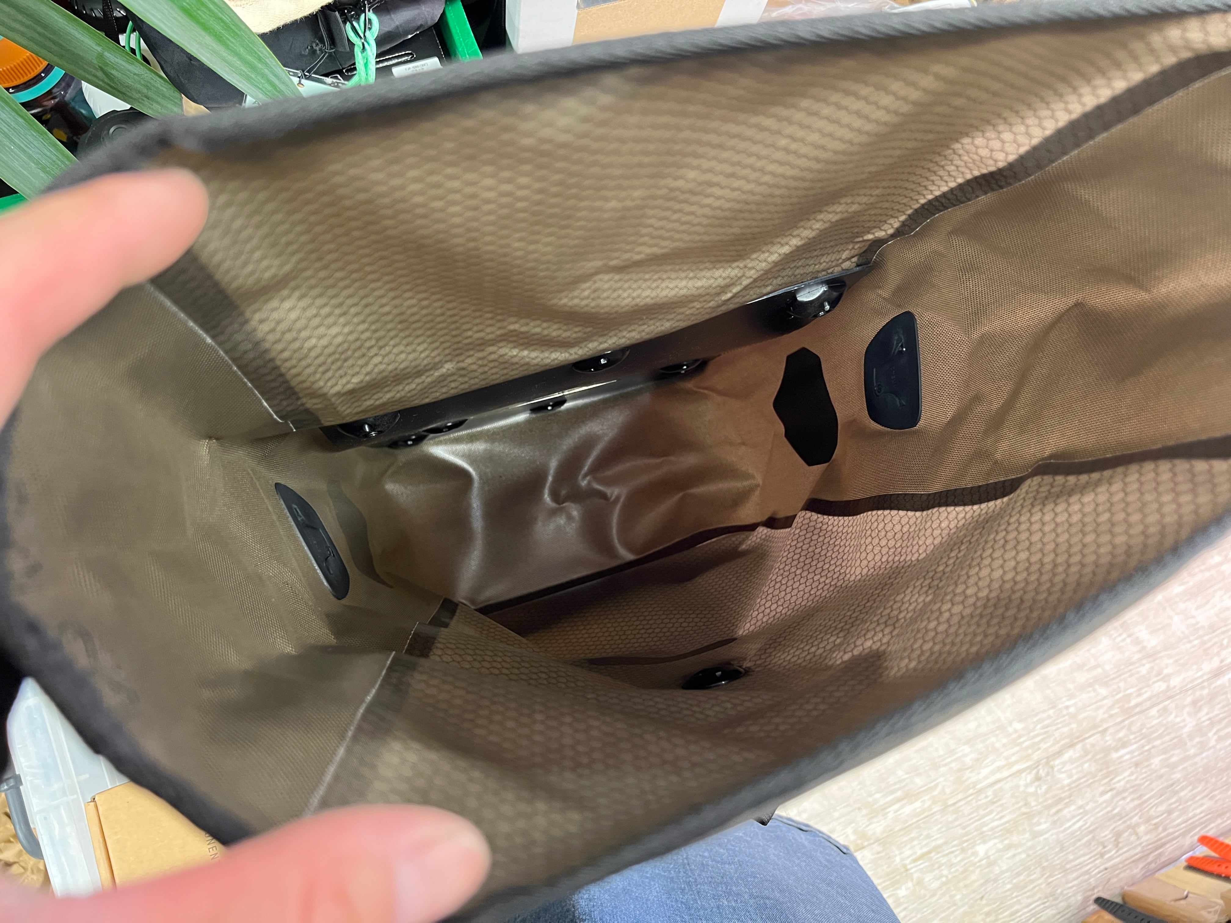 大きな開口部は物の出し入れがしやすく、開閉はロールクロージャー式で雨や埃から荷物をしっかり守ります。生地は軽量で引き裂けに強く、バッグ下部のキャリア固定用フックを2つ設けたアドベンチャーに適したモデルです。