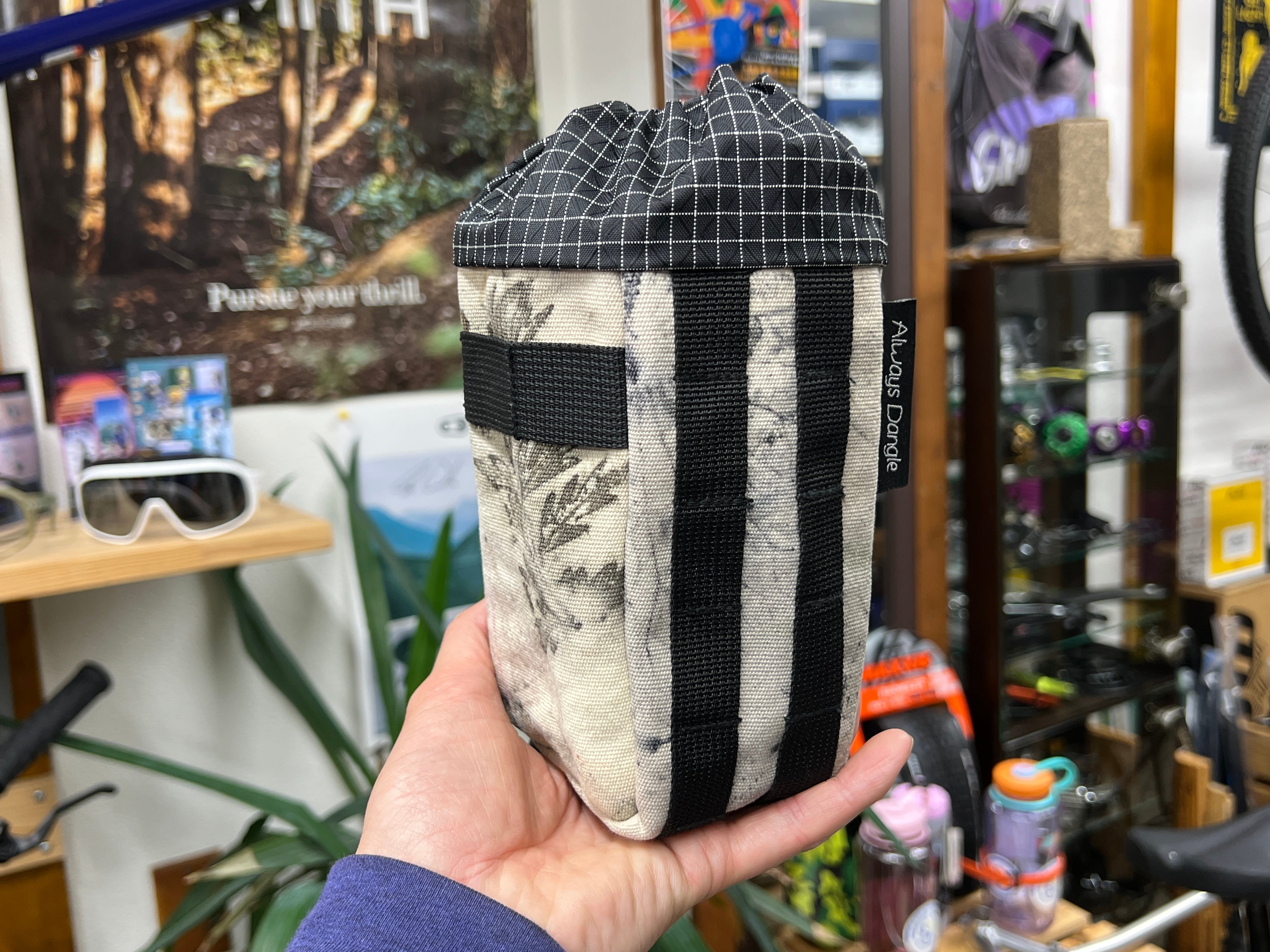 手元にボトルやスマホなどを入れられるステムポーチ、1リットルのナルゲンボトルも収まります。